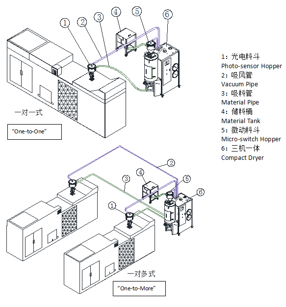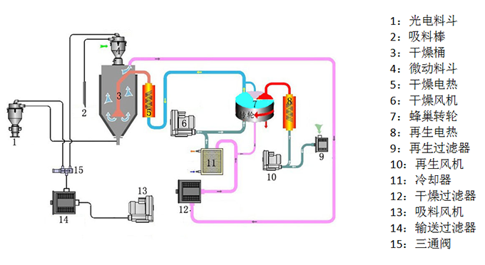 7. 熱料輸送可選配熱風回路密閉輸送裝置,可有效避免原料污染和回潮;
