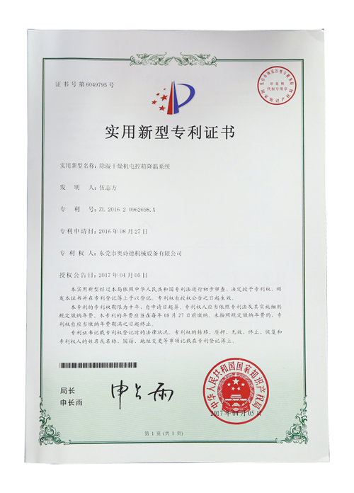 除濕干燥機電控箱降溫系統(tǒng)專利證書