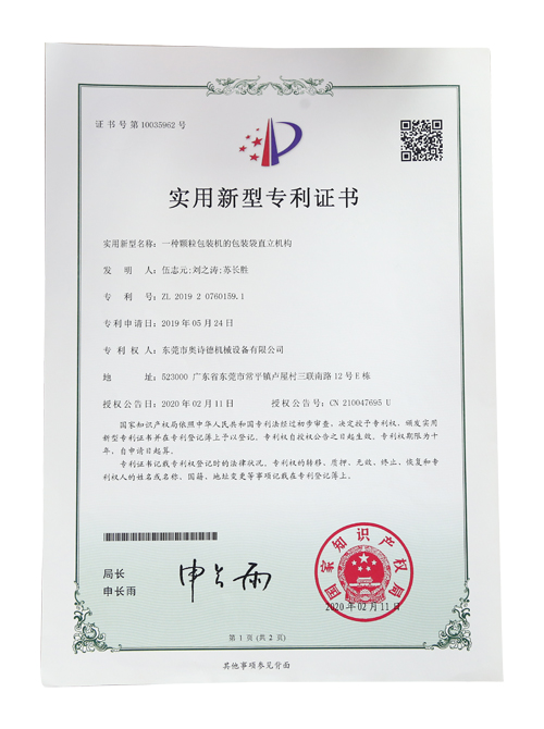 一種多種類精準打包的全自動顆粒包裝機專利證書